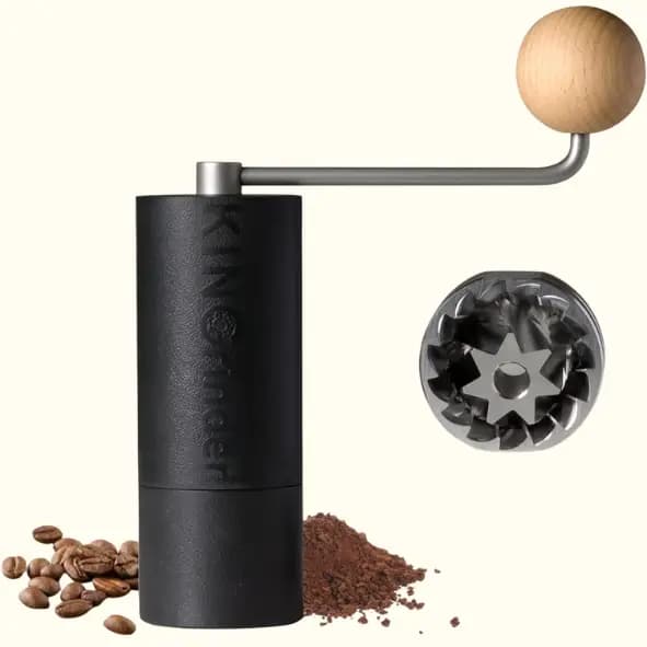 KINGrinder K6 - ręczny młynek do kawy z 200 stopniami regulacji, idealny do espresso, przelewów i french pressa. Wyposażony w stalowe żarna i innowacyjny, zewnętrzny panel regulacji.